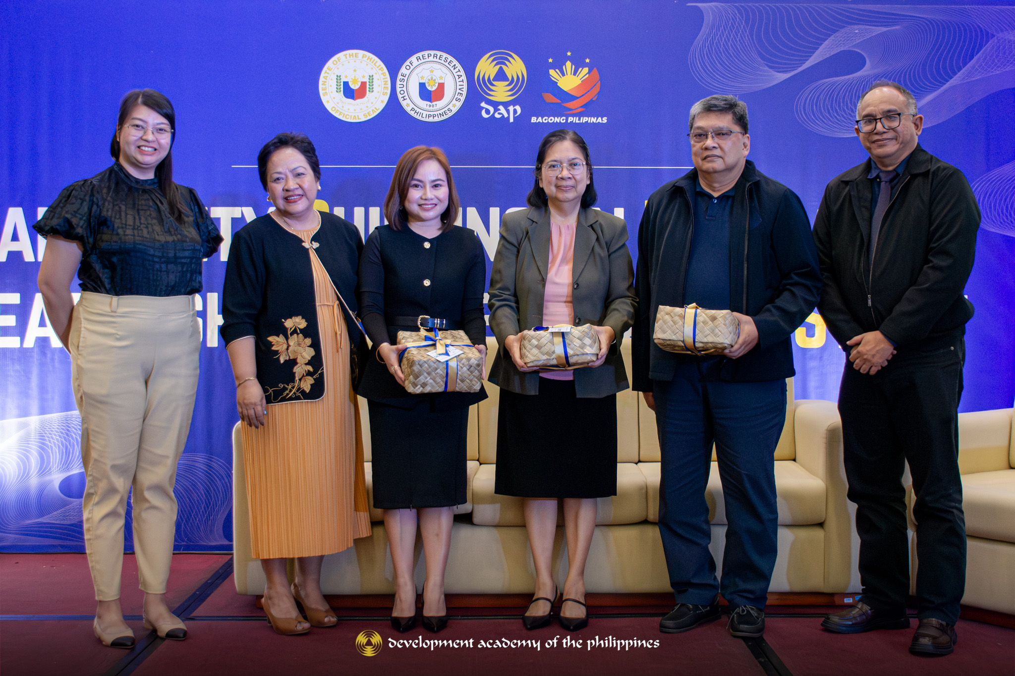 DAP-CFG Vice President Imelda Caluen (second from left), CBILLS Program Manager Ma. Czarina Krisha De Leon (leftmost), and DAP-CFG-PRO Director Gilbert Lumantao (rightmost) present tokens of appreciation to resource persons [L-R, from 3rd from left] moderator Ms. Villasante, ADG Acuña, and Ret. RADM Ong.