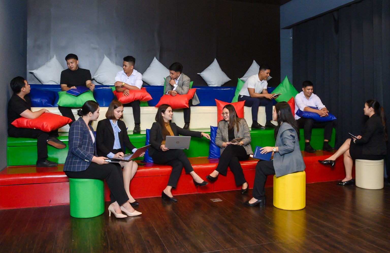 The Future Center and Innovation Laboratory pilot facility is a learning space designed to encourage participants to generate innovative ideas. It features four sets of pods, each equipped with an individual projector and capable of accommodating four to five people. The facility also includes a plenary hall with bleacher seating and an interactive projector, suitable for groups of 10 to 15 participants.